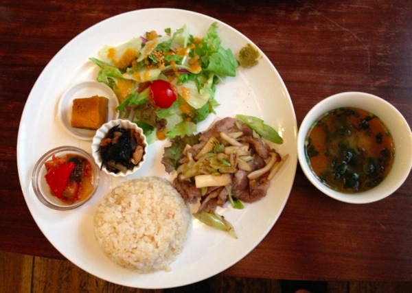 ごはんプレートのメインは、「三元豚の塩豚ネギキノコ炒め」と「塩麹サーモン南蛮漬け」から前者をチョイス。味噌汁もついてるのが、うれしい。