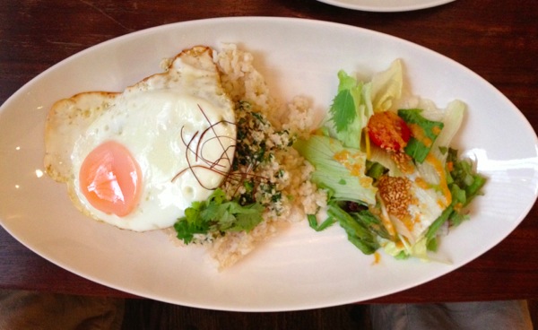タイ風ご飯は、たっぷりなパクチーと白身魚そぼろを玄米ご飯にあえてあって、目玉焼きがのっている。ご飯がめちゃうま!
