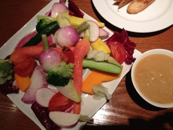 次にサラダ。色とりどりの野菜。アンチョビソースにつけて食べる。このソース、なかなか濃厚。