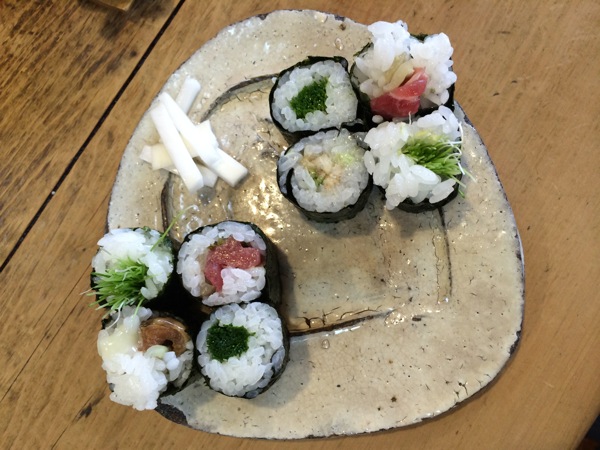巻物は、芽ネギ、あおさ、マグロ、イカ。添えてある、大根の漬物もおいしい。