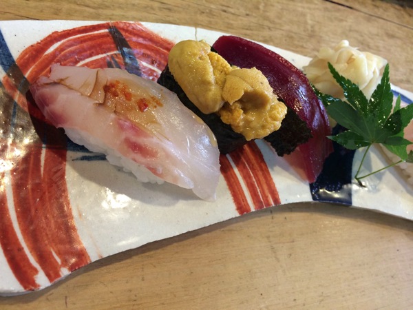 雲丹、マグロ、朝とれのヒラメのにぎり。激うま。