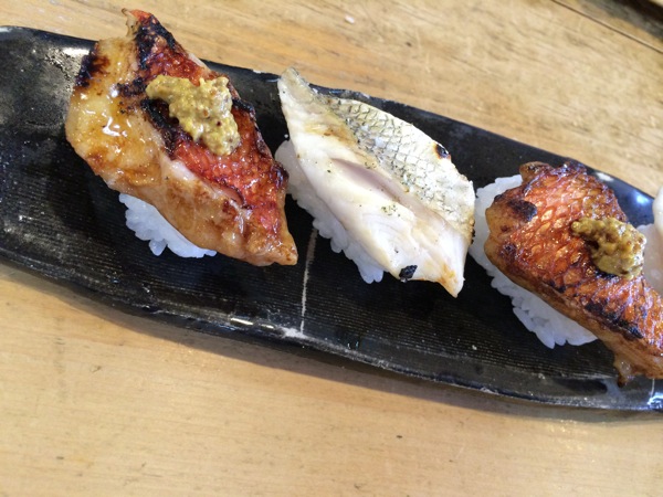 最後は、焼きにぎり鮨。左側の金目鯛は、醤油をくぐらせてあぶって焦げ目をつけてあり、オランダ製マスタードをちょこっと乗せてある。