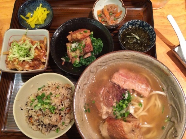 ソーキそばセットは、ソーキそば、ジューシー、ミミガーのピーナッツ味噌あえ、もずく酢、という充実ぶり。