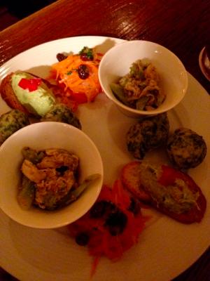 TAPAS盛り合わせ。イベリコハム、マリネ、人参とレーズンのサラダなど。
