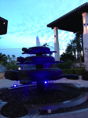 到着後から雨が降っていて、空港からホテルまでの車のなかで現地ガイドが、数日前から台風がきていて、しばらく雨かもといっていて、ちょうど雨季の時期でもあったので、雨が多いのかなぁと少し心配していたが、きれいに空が晴れて、噴水もブルーにライトアップしていてきれいでした。