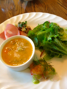 ベビーリーフのサラダと前菜4種盛り(写真)、パスタ (本日のパスタより選べる)、カフェで、1500円は、安い!