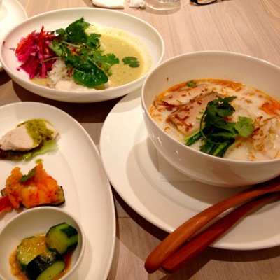写真右は、ポークと豆乳のピリ辛ライスヌードル。左奥は、グリーンハーブカレーライス。