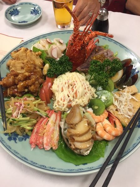 アワビ、蟹、エビ、くらげ、蒸し鶏、ピータン、貝柱などなど、オンパレード!