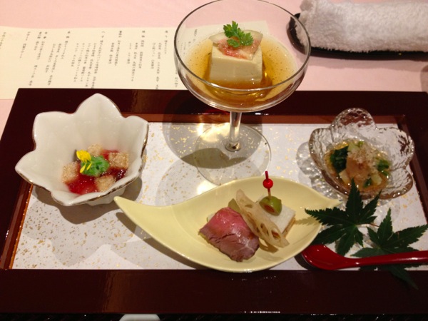 前菜、右は、松茸、黄ニラ、ほうれん草のおひたし。