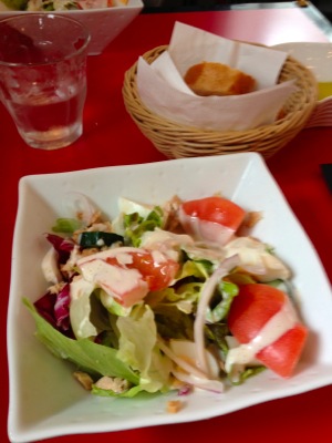 まずはサラダ。新鮮な色とりどりの野菜が、目を楽しませ、舌を喜ばせる。
