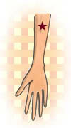 手のひら側で、手首とひじのちょうど中間。前腕の中央。